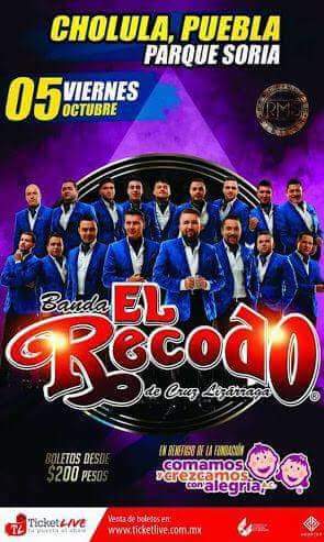 Recodo de Don Cruz Lizárraga, estará llegando a Puebla el viernes 5 de octubre, para presentarse en “Parque Soria” de Cholula, Puebla, como parte de un evento a Beneficio de la Fundación: “Comamos y Crezcamos con Alegría”. Los costos para su presentación son: General Pie $240, Grada Lateral $400, Grada Central $460, Grada Preferente $690, Preferente $1,000, VIP $1,950 y Gran VIP $2,500 pesos. Y pueden adquirirse a través del sistema de boletaje http://www.ticketlive.com.mx, Sucursal Kompter Gym y Auditorio del Complejo Cultural Universitario.