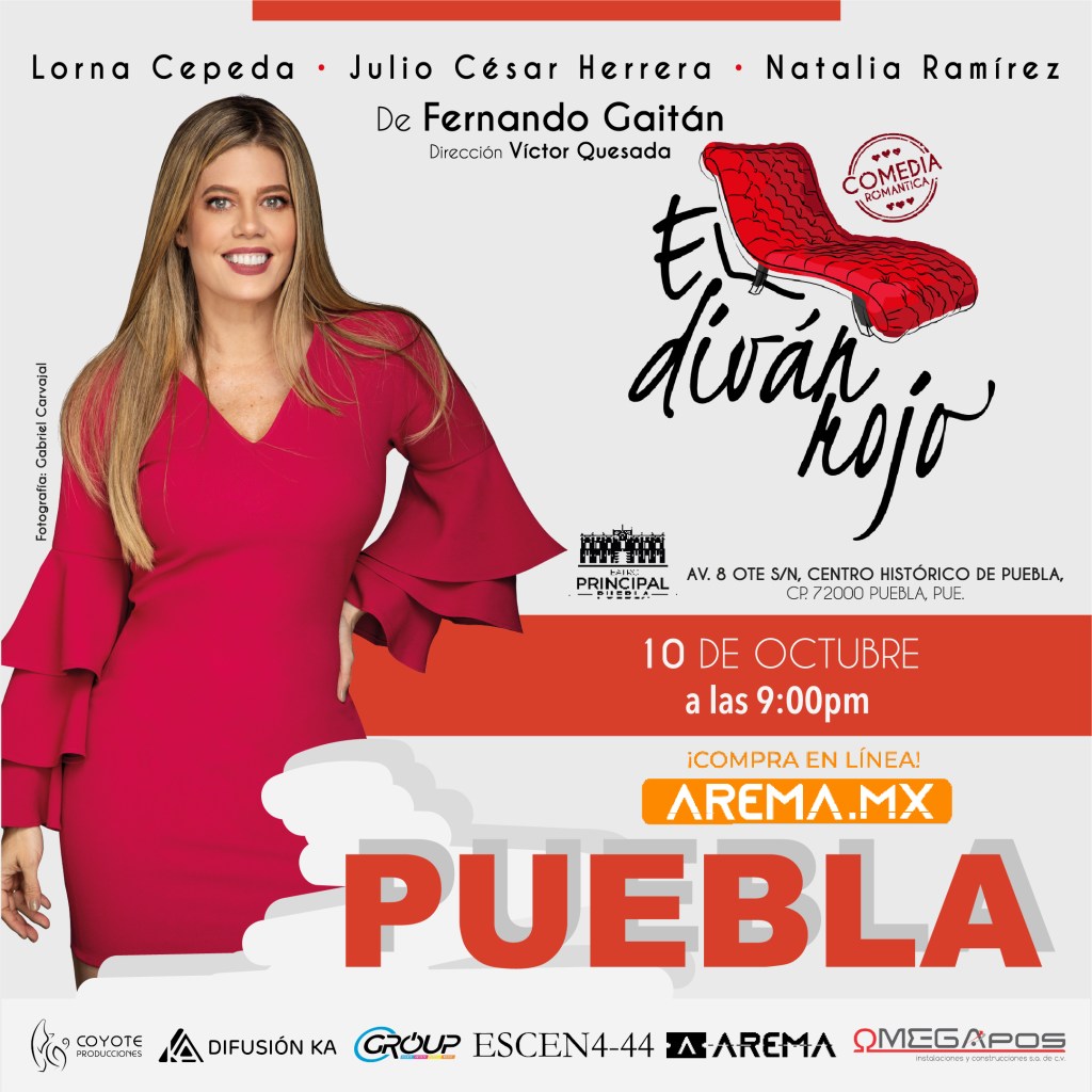 Este 10 de octubre llegan al Teatro Principal de #Puebla directamente de la telenovela #YoSoyBettyLaFea: Natalia Ramírez, Lorna cepeda y Julio César Herrera con #eldivanrojo; una divertida comedia romántica que nos habla de un prestigioso sexólogo, el doctor Luis Mario Dávila, quien debe emplear a fondo todos sus conocimientos y estrategias para atender en su consultorio a Carla Santamaría, una mujer obsesiva de los hombres y el sexo, que busca el camino que la lleve a amar a un solo hombre. Una interesante misión que tiene un sinfín de matices.